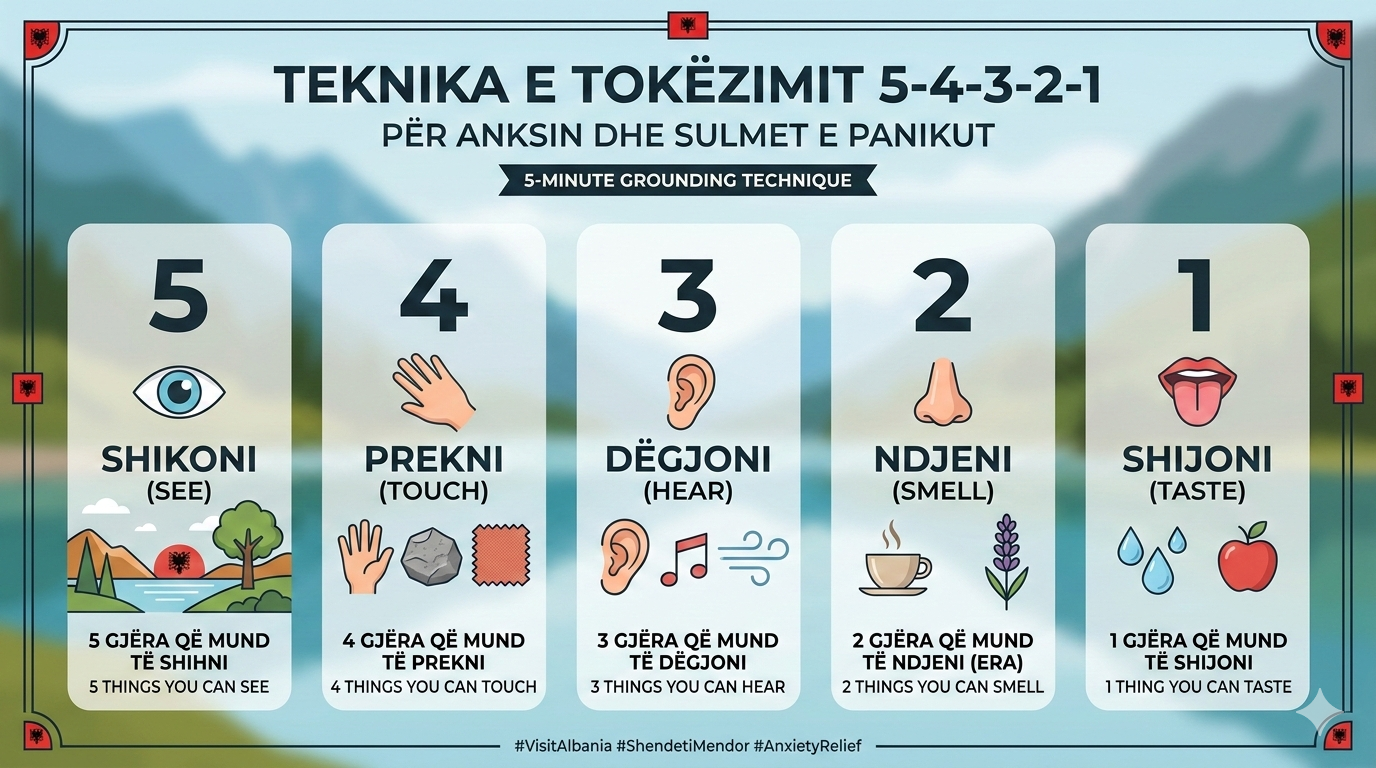 Kur ndodheni në mes të një sulmi paniku, truri juaj “shkëputet” nga realiteti dhe fokusohet te frika e brendshme. Teknika 5-4-3-2-1 është një metodë psikologjike e njohur si “grounding” (tokëzim), e cila detyron trurin të rikthehet në momentin aktual përmes shqisave.